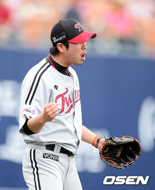 1회말 2사에서 LG 우규민이 넥센 유한준의 3루땅볼을 벨의 호수비로 처리하며 기뻐하고 있다.