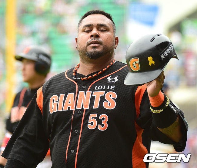 1회초 롯데 공격 1사 1루 상황 박종윤의 좌중간 2루타 때 홈으로 쇄도한 주자 히메네스가 두산 포수 양의지의 태그에 걸려 아웃된 뒤 아쉬워하며 더그아웃으로 들어오고 있다.