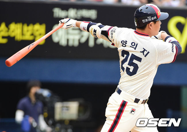2회말 두산 공격 1사 주자없는 상황 양의지가 추격의 좌월 솔로포를 날리고 있다.