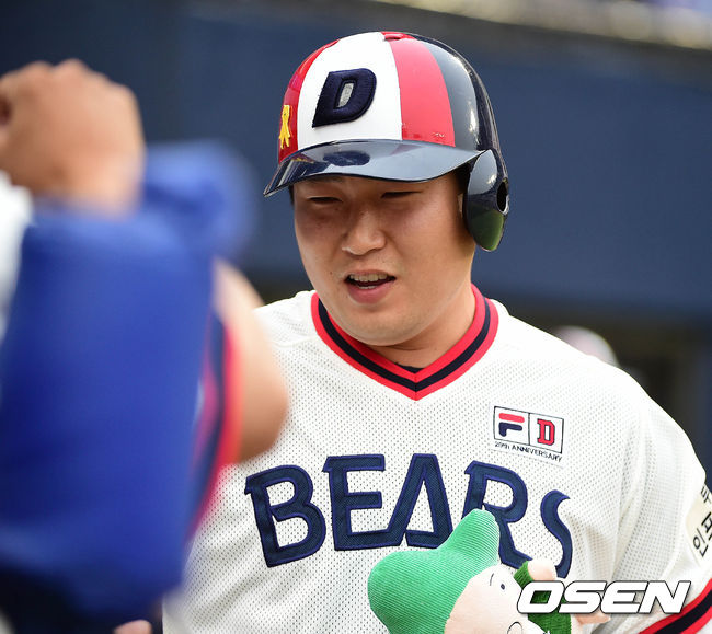 2회말 두산 공격 1사 주자없는 상황 양의지가 추격의 좌월 솔로포를 날리고 홈을 밟은 뒤 더그아웃 동료들과 인사를 나누고 있다.