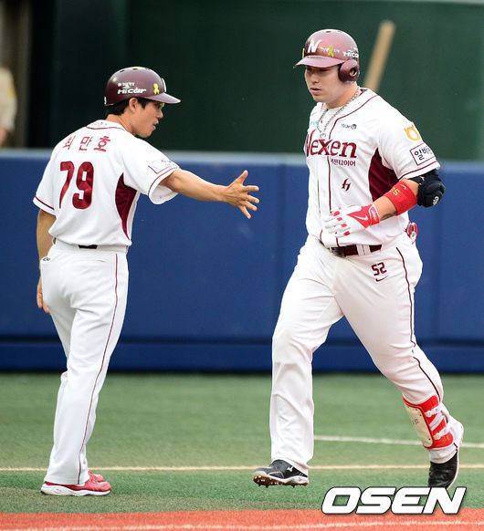2회말 무사에서 넥센 박병호가 동점 솔로포를 날리고 최만호 코치와 세레모니를 하고 있다.