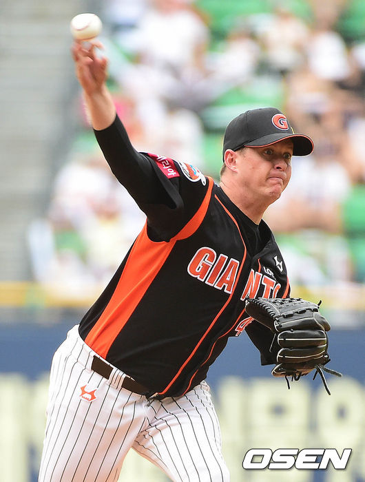 롯데 선발 옥스프링이 힘차게 공을 뿌리고 있다.
