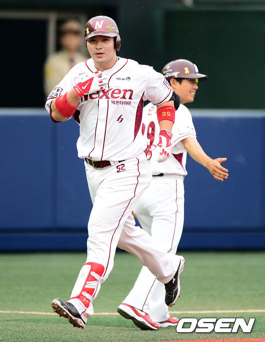 2회말 무사에서 넥센 박병호가 동점 솔로포를 날리고 최만호 코치의 하이파이브를 그냥 지나치자 최만호 코치가 미소짓고 있다.