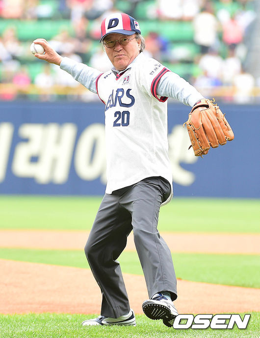 두산 베어스 후원 20주년을 기념해 윤윤수 휠라 회장이 시구자로 나서 힘차게 공을 던지고 있다.
