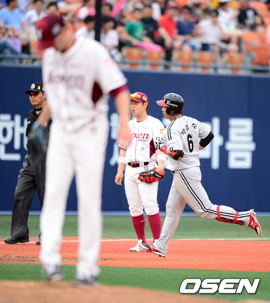 3회초 무사에서 LG 박경수가 좌측 담장을 넘기는 솔로포를 날리고 그라운드를 돌고 있다.