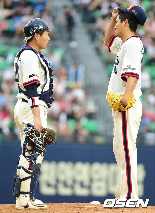 3회초 롯데 공격 2사 만루 상황 두산 선발 노경은과 포수 양의지가 대화를 나누고 있다.