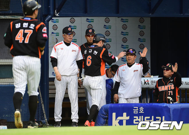 3회초 롯데 공격 2사 만루 상황 정훈의 적시 2타점 좌측 2루타 때 홈을 밟은 문규현과 강민호가 김시진 감독을 비롯한 코칭스태프들과 인사를 나누고 있다.