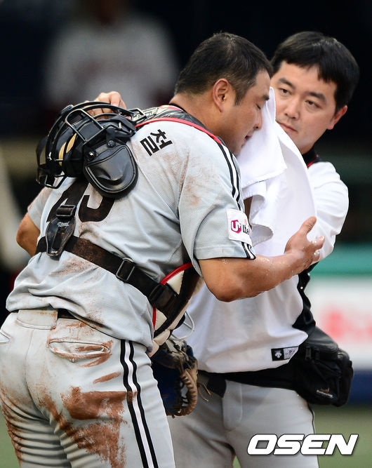 4회말 무사에서 LG 최경철이 넥센 서동욱의 배트를 피하다 미끄러 넘어지자 코칭스태프가 나와 흙을 털어주고 있다.