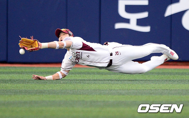 5회초 1사에서 넥센 서동욱이 LG 박용택의 타구에 몸을 날렸지만 놓치며 2루타를 허용하고 있다.