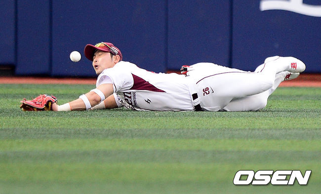 5회초 1사에서 넥센 서동욱이 LG 박용택의 타구에 몸을 날렸지만 놓치며 2루타를 허용하고 있다.