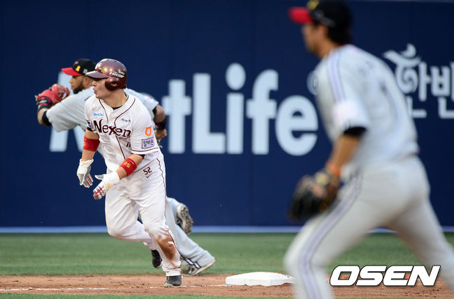 5회말 1사 만루에서 넥센 2루 주자 박병호가 윤석민의 유격수 땅볼에 LG 오지환의 악송구로 홈까지 내달리고 있다.
