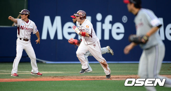 5회말 1사 만루에서 넥센 2루 주자 박병호가 윤석민의 유격수 땅볼에 LG 오지환의 악송구로 홈까지 내달리고 있다.
