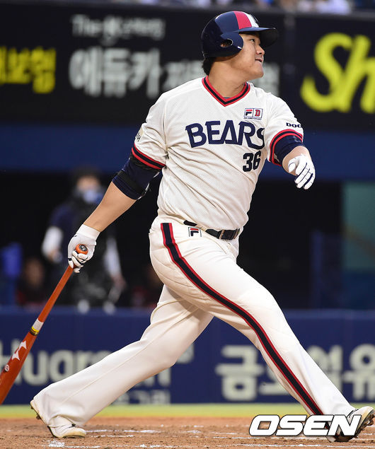 6회말 두산 공격 1사 주자없는 상황 오재일이 우중간 솔로포를 날리고 있다.