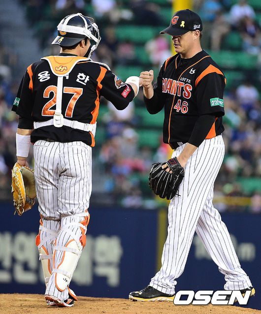 7회말 두산 공격 1사 주자없는 상황 롯데 선발 옥스프링이 마운드를 내려가며 포수 용덕한과 인사를 나누고 있다.