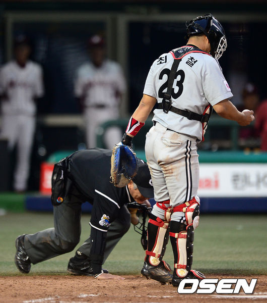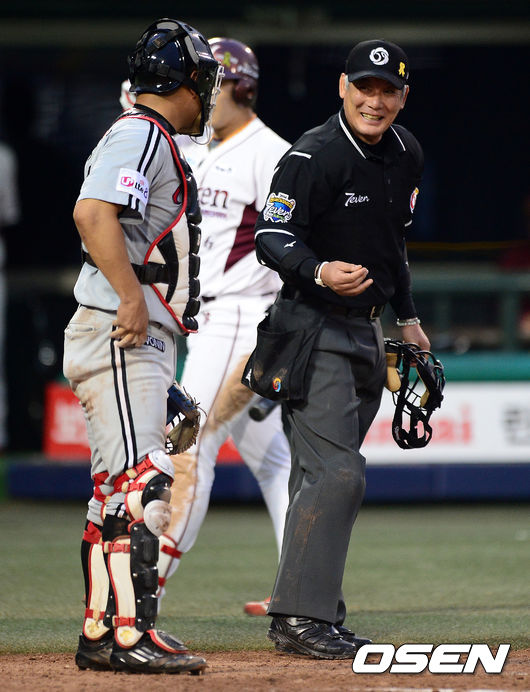 6회말 2사 2,3루에서 김병주 구심이 넥센 강정호 타석에 LG 정찬헌의 볼을 놓치고 볼을 찾던 최경철에 걸려 넘어지며 멋쩍은 미소를 짓고 있다.