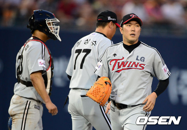6회말 2사 1,3루에서 LG 유원상이 강판당하고 있다.