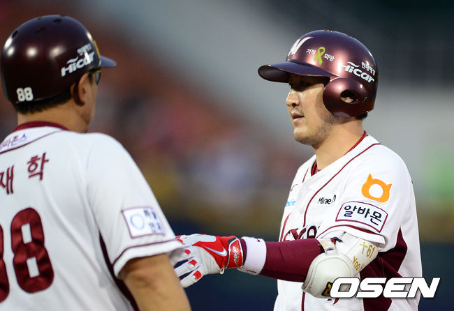 6회말 2사 2루에서 넥센 유한준이 1타점 적시타를 날리고 기뻐하고 있다.