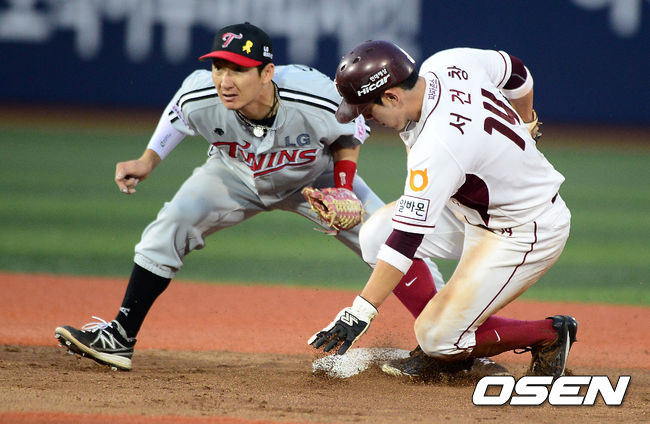 6회말 2사 1루에서 넥센 서건창이 LG 손주인의 태그에 앞서 2루 도루에 성공하고 있다.