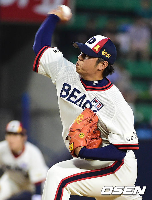 8회초 마운드에 오른 두산 투수 유창준이 힘차게 공을 뿌리고 있다.