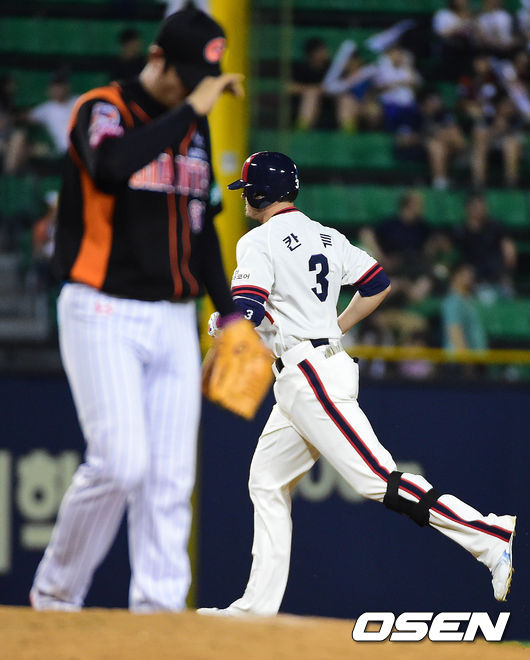 8회말 두산 공격 무사 1루 상황 칸투가 중월 투런포를 날리고 그라운드를 돌고 있다.