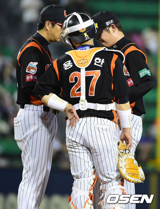 8회말 두산 공격 2사 만루 상황 롯데 투수 김성배가 정민태 코치와 대화를 나누고 있다.