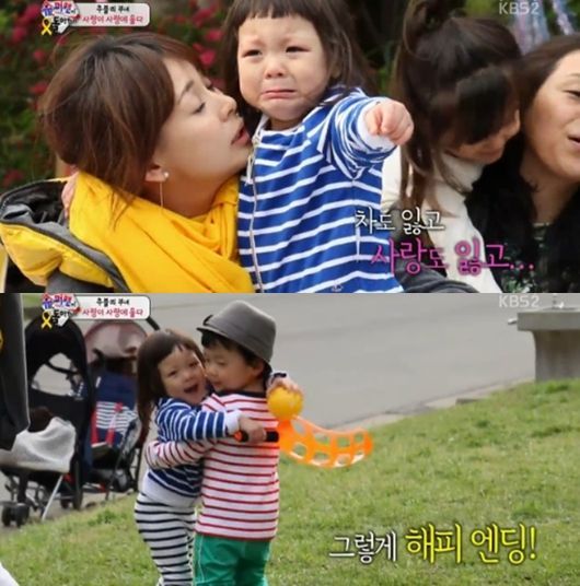 그런데, 장난감 자동차 때문에 사랑이가 눈물을 흘리고 말았습니다. 핑크색 장난감 자동차에 올라탄 사랑이는 아빠 추성훈의 도움을 거부하고 유토가 밀어주는 자동차 놀이에 신이 났는데요. 자신의 차례가 끝나고 다른 여자 친구가 자동차에 올라타자 또 한 번 친절함을 발휘하는 유토 때문에 심통이 났나 봅니다. 사랑이는 자신의 곁을 떠나는 유토의 모습을 보며 눈물을 쏟기 시작한 것이지요.