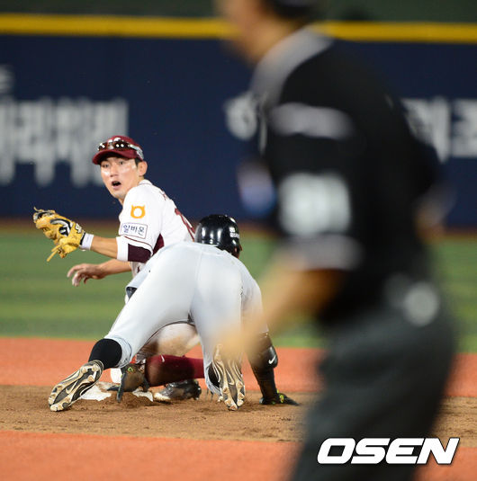 8회초 1사 1루에서 넥센 서건창이 LG 오지환의 2루타에 오지환을 2루에서 태그하며 심판 판정을 기다리고 있다.