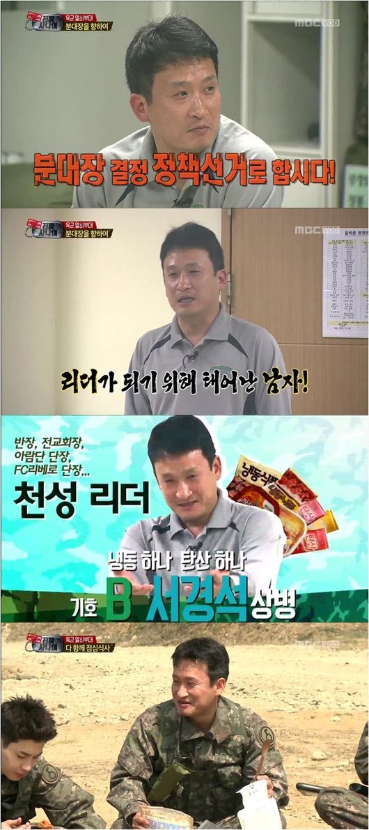 서경석은 지난 1일 방송된 MBC 예능프로그램 ‘일밤-진짜 사나이’에서 샘 해밍턴, 일반 병사 김경우와 분대장 선출을 위해 경쟁을 했다. 체력적으로 우위인 김경우가 될 가능성이 높은 가운데 서경석은 다소 얕은 수를 써가며 분투했다. 후임들에게 급하게 친절하게 굴거나, 현실성이 떨어지는 공약을 남발했다. 물론 체력과 사격 검증이 분대장 선출의 기본적인 조건이었지만 서경석은 후임들의 마음을 사로잡기 위해 노력했다.