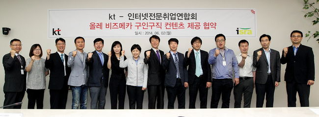 중소기업 비즈니스 포털 ‘올레 비즈메카’를 운영하고 있는 KT는 2일 KT 광화문 사옥 글로벌 대회의실에서 인터넷전문취업연합회과 손잡고 ‘중소기업의 구인구직 콘텐츠 제공에 관한 업무협약’을 맺었다.