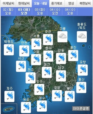 내일 날씨는 오늘 단오부터 내리던 비가 오후에 중부지방을 중심으로 차츰 그칠 것으로 보인다.