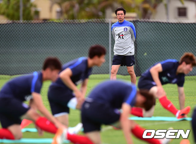 3일(이하 한국시간) 미국 플로리다주 마이애미 세인트 토마스 대학에서 열린 대표팀 전지훈련에서 홍명보 감독이 선수들의 훈련을 지켜보고 있다.