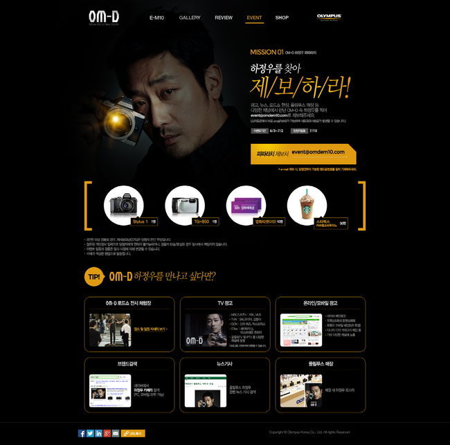 올림푸스한국(www.olympus-imaging.co.kr)은 7월 2일까지 자사 플래그십 미러리스 카메라 OM-D 시리즈의 최신작 OM-D E-M10의 광고 속, 하정우의 이미지를 촬영하여 제보하는 파파라치 이벤트(www.omdem10.com)를 진행한다.