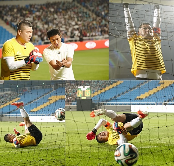 이와 함께 골대에 대롱대롱 매달려 있는 강호동의 모습이 시선을 사로잡는다. 굳게 다문 입과 결의에 찬 눈빛에서는 호탕한 웃음기를 싹 뺀 비장미가 느껴진다. 무엇보다 상대방의 슈팅에 가감이 몸을 날리며, 골문 안으로 굴러가는 공을 향해 시선을 떼지 못 하는 모습에서는 공을 향한 강한 집념과 열정을 엿볼 수 있다.