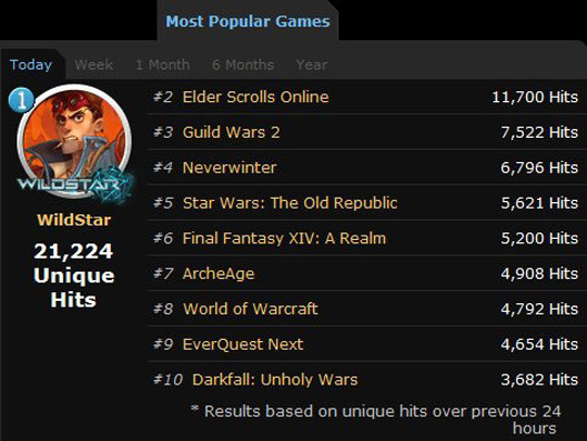 와일드스타는 북미 최대 게임 사이트인 ‘MMORPG.com’에서 ‘2014년 가장 기대되는 MMO(Most Wanted MMOs of 2014)’로 뽑혔고, 현재 ‘가장 인기 있는 게임(Most Popular Games)’ 1위이다.