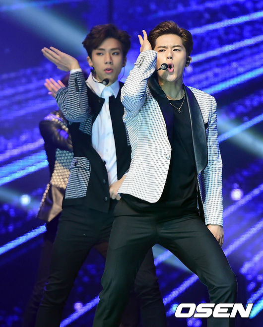 그룹 제국의 아이들 동준과 케빈이 화려한 무대를 펼치고 있다.