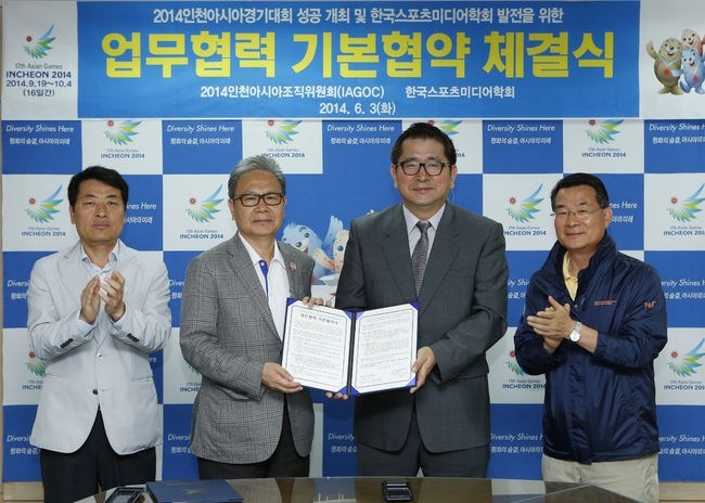 2014 인천아시아경기대회 조직위원회(위원장 김영수)는 3일 인천 송도 미추홀타워 영상회의실에서 한국스포츠미디어학회(회장 이관식)와 인천아시안게임의 성공적인 개최와 한국 스포츠미디어학의 발전을 위한 업무협약을 체결했다.