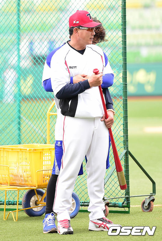 3일 오후 대구구장에서 열리는 '2014 한국야쿠르트 세븐 프로야구' 삼성 라이온즈와 KIA 타이거즈의 경기를 앞두고, KIA 한대화 코치와 삼성 박석민이 인사를 나누고 있다.