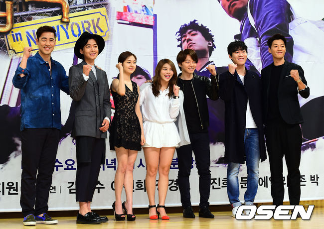 3일 오후 서울 목동 SBS에서 진행된 파일럿 예능프로그램 '도시의 법칙 in 뉴욕' 제작발표회에서 김성수 정경호 백진희 에일리 문 존박 이천희가 포토타임을 갖고 있다.