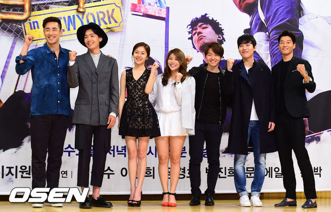 3일 오후 서울 목동 SBS에서 진행된 파일럿 예능프로그램 '도시의 법칙 in 뉴욕' 제작발표회에서 김성수 정경호 백진희 에일리 문 존박 이천희가 포토타임을 갖고 있다.