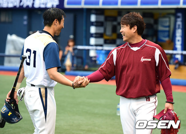 경기에 앞서 넥센 송신영이 NC 이현곤과 인사를 나누고 있다.
