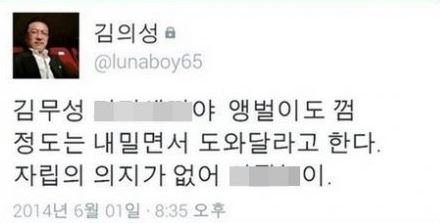 김의성은 1일 오후 자신의 트위터에 "김무성 거지 XX야, 앵벌이도 껌 정도는 내밀면서 도와달라고 한다. 자립의 의지가 없어 XXX이"라는 글을 올렸다. 이같은 사실이 온라인을 통해 삽시간에 퍼지면서 포털사이트의 검색어 상위권을 유지하고 있다.