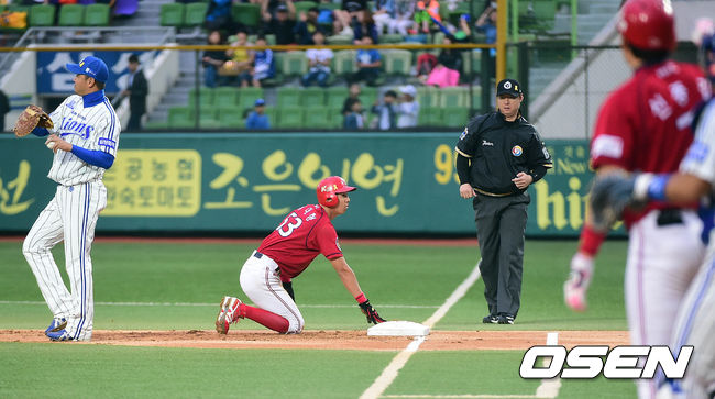 1회초 KIA 공격 1사 1루 상황 주자 이대형이 삼성 선발 윤성환의 견제에 걸려 아웃된 뒤 아쉬워 하고 있다.