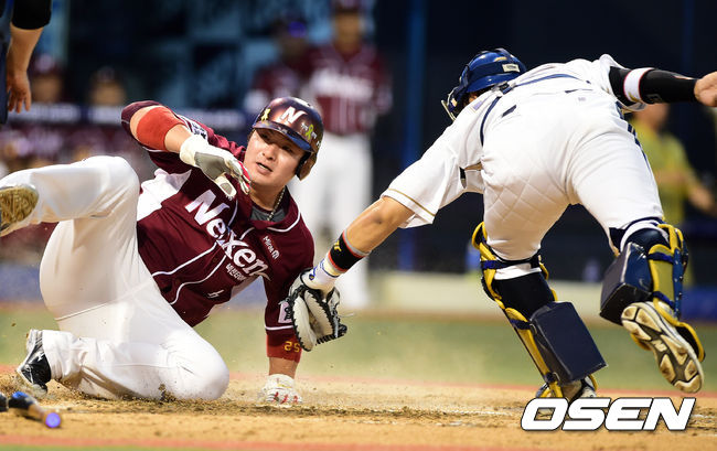2회초 2사 1,2루에서 넥센 박병호가 문우람의 1타점 적시타에 홈에서 슬라이딩하며 NC 김태군의 태그에 앞서 세이프되고 있다.