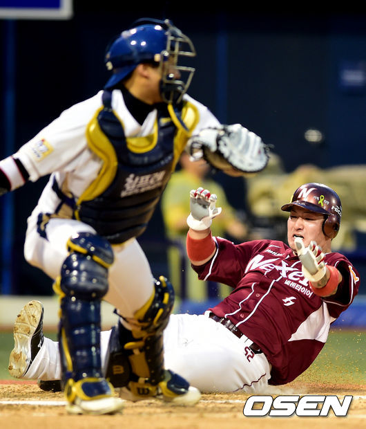 2회초 2사 1,2루에서 넥센 박병호가 문우람의 1타점 적시타에 홈에서 슬라이딩하며 NC 김태군의 태그에 앞서 세이프되고 있다.