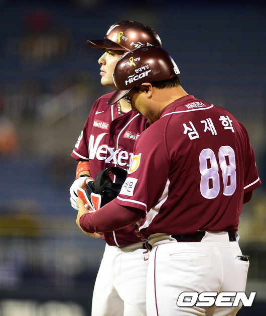 3회초 1사 1,3루에서 넥센 박병호가 1타점 적시타를 날리고 심재학 코치와 기뻐하고 있다.