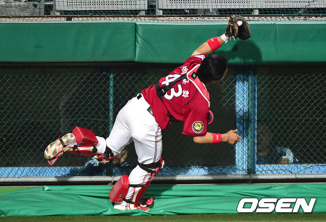 4회말 삼성 공격 선두타자로 나선 이승엽의 파울 타구를 KIA 포수 백용환이 끝까지 쫓아가 잡아내고 있다.