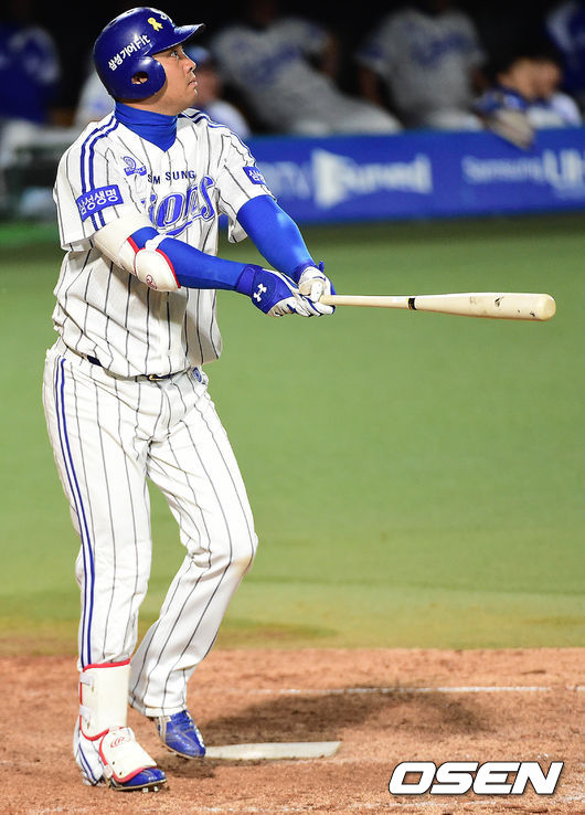 5회말 삼성 공격 1사 1, 3루 상황 채태인이 1타점 중견수 희생플라이를 날리고 타구를 바라보고 있다.