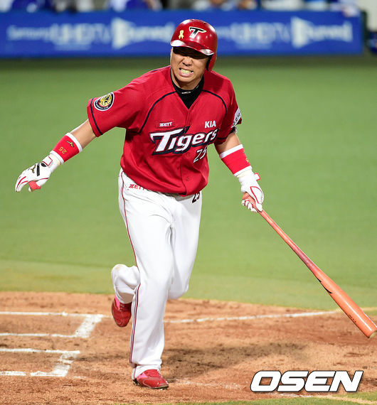 6회초 KIA 공격 1사 주자없는 상황 이범호가 중견수 플라이를 날린 뒤 아쉬워하고 있다.