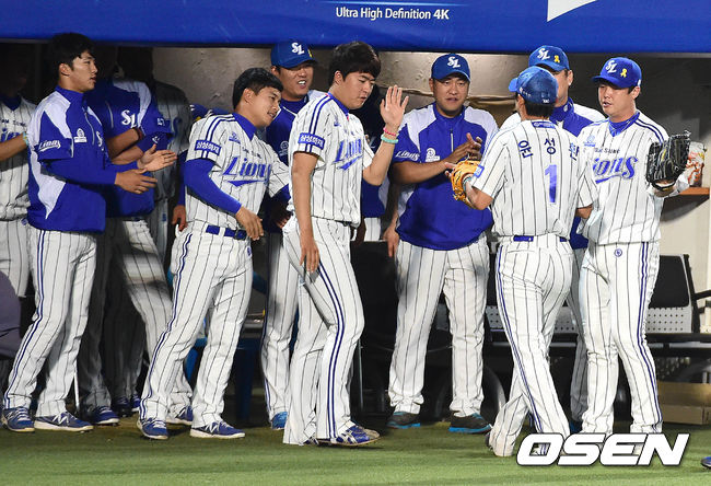 7회초 KIA 공격 2사 1루 상황 삼성 선발 윤성환이 마운드를 내려가며 더그아웃 동료들의 격려를 받고 있다.