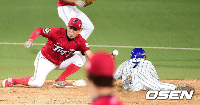 7회말 삼성 공격 1사 1루 상황 김상수가 2루 도루에 성공하고 있다. KIA 2루수는 박기남.